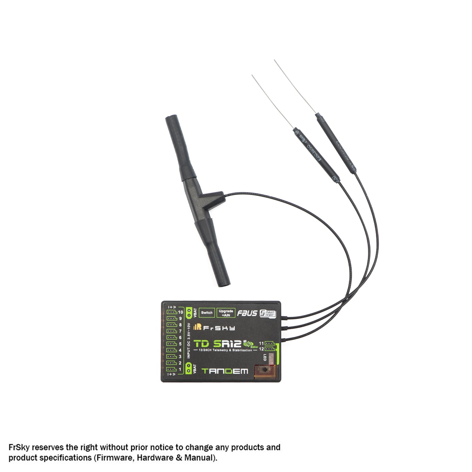The Tandem series receivers adopt a dual-band antenna design (2.4GHz & 900MHz) that provides multi-directional wide coverage for the remote signal. The telemetry data (Power & Signal related) can be recorded using the built-in black box module within the Tandem receiver, useful for capturing data from any unusual status during the flight.
